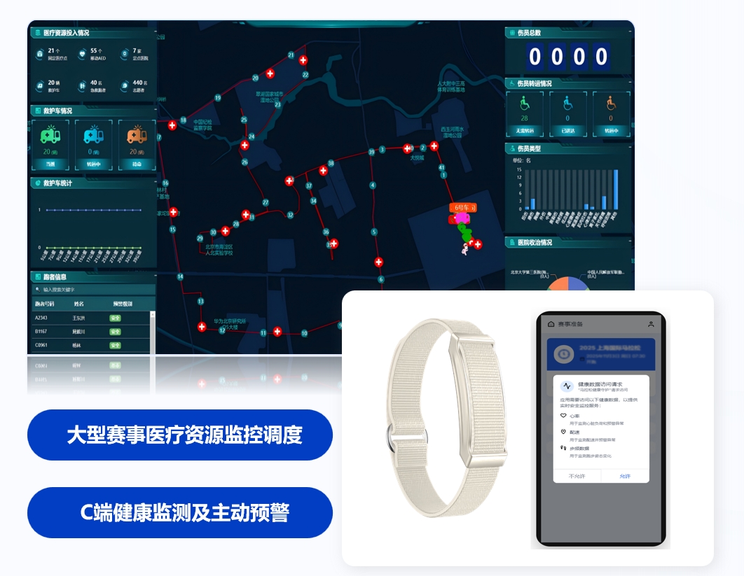 本项目是面向城市级马拉松赛事主办方、卫生健康部门的软硬件结合技术服务解决方案,以单次赛事为服务周期,核心目标是构建“监控 - 调度 - 救治 - 管理”全流程赛事医疗保障体系。