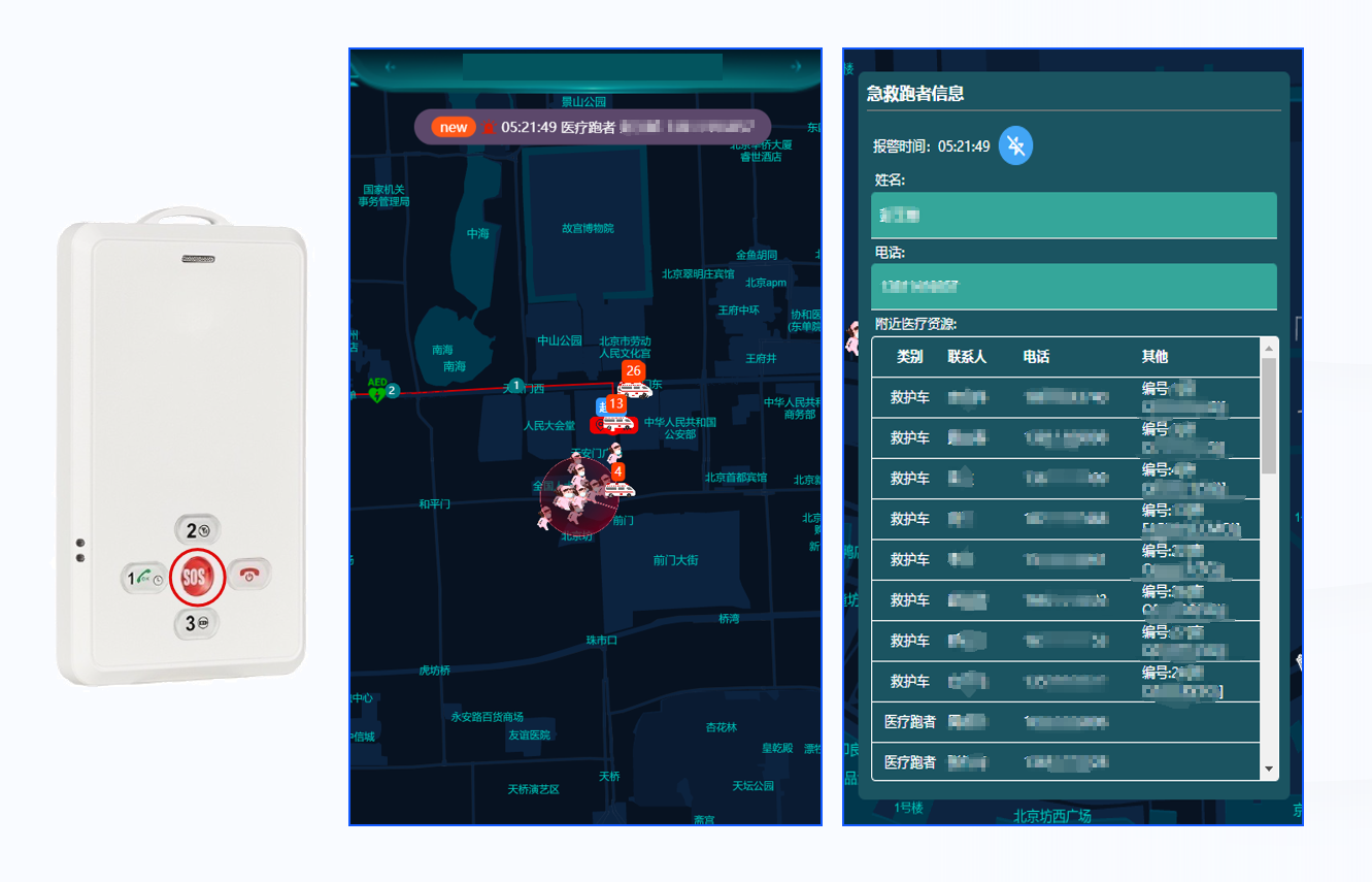 突发伤情事件可触发SOS报警,报警时间自动同步至指挥中心,自动显示报警人一公里范围内所有医疗资源,便于指挥官动态调度